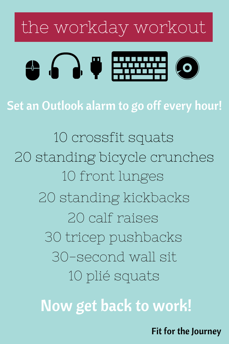 With that in mind, I created this easy Workday Workout. This workout includes a set of exercises that you can perform anywhere. If you work in a fun, casual environment (lucky you!), you can do these at your desk or in your office or cubicle. If you don’t (sorry!)… you can do these in a stairwell or even a bathroom stall! (As a professional at stealthy fitness, I speak from experience.)