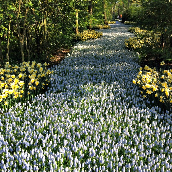 At the Keukenhof, there are fields full of thousands of tulips, and there’s also a botanic garden portion, where they have many other flower varieties as well. I loved the creativity behind some of these arrangements, like this “river” of hyacinth.