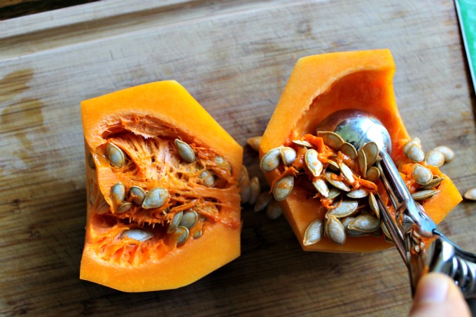 Slice that base in half, and you’ll expose all the seedy, fleshy, goopy part of the squash. You can save the seeds and roast them if you’re fancy. Or, do like me and use an ice cream/cookie dough scoop to scrape all that gunk out and throw it directly into the garbage.