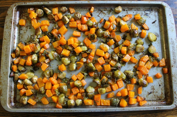 - Cover a large baking sheet with foil, then combine the squash and sprouts on the pan.