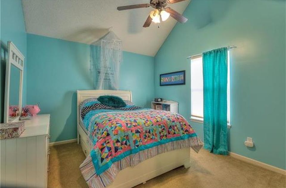 The color in person was even louder and it was honestly a little bit stressful to be in this room! Also, look closely behind that canopy thing, and there’s a quote in big black vinyl lettering on the wall. I can’t remember what it said because I peeled it off stat, but something about attitude and motivation (insert eye roll). Note also the window covering, which the previous owners left behind when they moved out. It doesn’t look that bad in this photo, BUT. The curtain was this plasticky stiff material that I could not handle, and the blinds… oh the blinds. Yellowing, ripped cellular blinds. So bad.