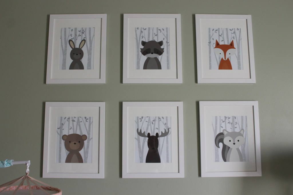 Because I’m Madame Safety Police, those woodland prints are not just hung willy-nilly above the crib. I made sure to securely screw each of them into a stud, meaning that they’re not going anywhere on their own. Once baby is in his crib more (hahahaha), I’ll pull the crib out from the wall several inches so he can’t reach up and knock them down.