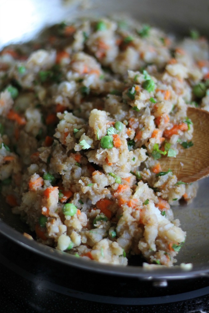 Add the mashed potatoes to the skillet and use a wooden spoon to combine with the vegetable mixture. Add 1/4 cup water or more as needed to stir and evenly incorporate.