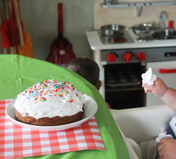And for the birthday boy, I made this healthy smash cake! I used coconut whipped cream for the “frosting,” and I wasn’t sure how the consistency would work, but it held up surprisingly well! What I cropped out of this photo (since I’m no longer sharing photos of my babies’ faces here) is Sawyer bawling his eyes out over his mother baking, decorating, and serving him a cake. How dare I!