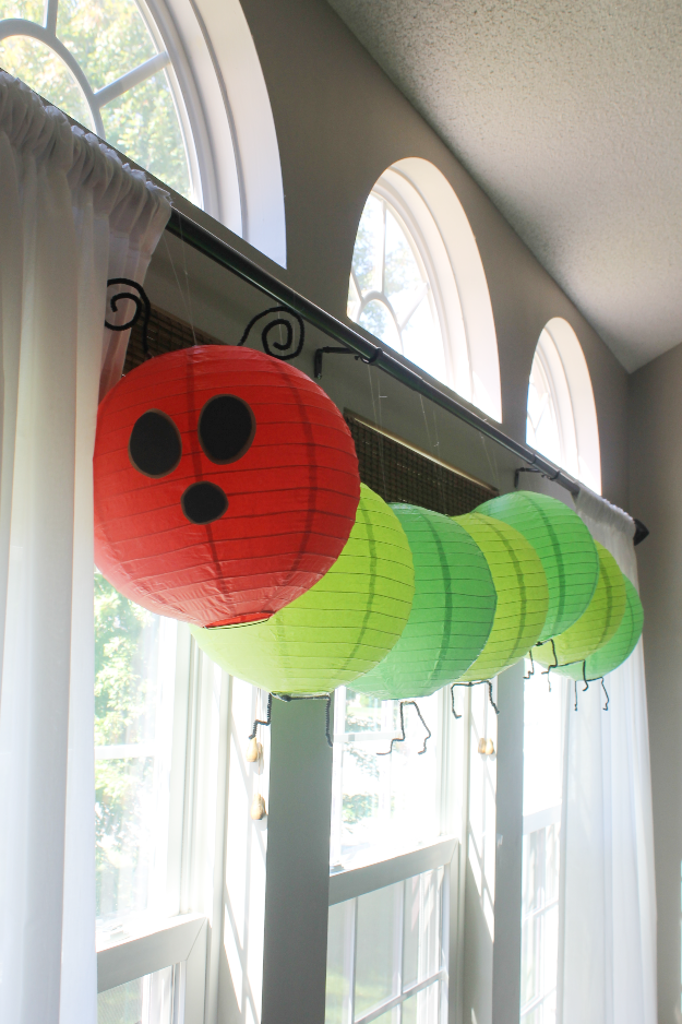I also made this caterpillar using a red paper lantern and alternating green ones. Time consuming, but easy! I added black pipe cleaners for the antennae and legs and then just cut out some eyes and a mouth from black and brown construction paper. I hung the caterpillar from the curtain rod using fishing line, and it worked out great!