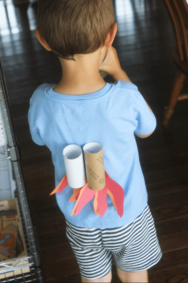 It’s cool today (finally!!), but lately, we’ve been suffering through some 100 degree/9,000,000% humidity level days around here. It’s been tough to stay outside for very long! So we’ve recently been back on the “scramble for indoor activities that will keep the kids occupied and happy” train, which led us me to create this toilet-paper-roll-and-construction-paper jet pack. I was surprised at how well it held up (all day!) and how much entertainment he got out of it. Creativity (and recycling!) for the win.
