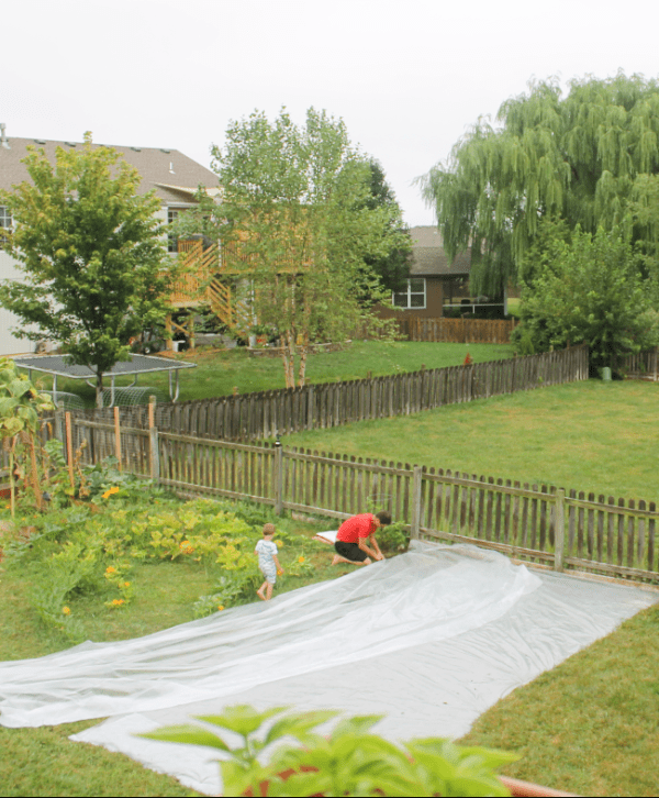 So we’re currently using clear plastic sheeting to kill the grass in this photo, then after we harvest all the pumpkins, we’ll remove the vines and kill the grass underneath, too. In the spring, we’ll build two more raised beds on those bare plots. I honestly want to kill ALLLLLL the grass in our whole yard now (especially after reading this book!). I’m a very gung-ho person; when I decide I want to do something, I am ALL IN, but Ben is a little more measured, so we’re doing it a little at a time. Snooze. Regardless, I’m excited. Good riddance, grass!