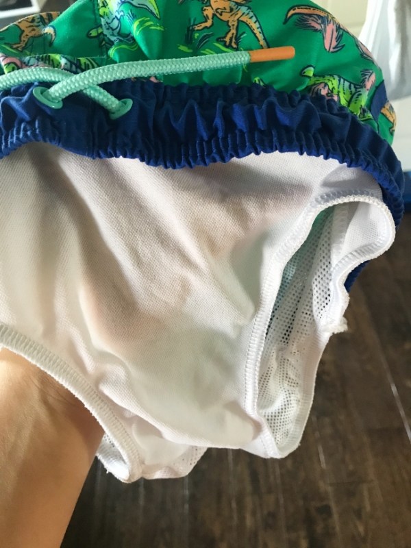 I bought the kids some Cat & Jack swim trunks on an end-of-season sale recently, and I was thrilled to see that they’ve modified their mesh inserts! In most kids’ swim trunks (and even in Cat & Jack ones prior to this year), the mesh holes are far too big and pose a huge safety hazard for little genital skin which can get caught inside. (And it doesn’t matter if your boys are intact or circumcised.) I’ve always simply cut out the mesh insert to protect my boys, and I recommend doing the same for any trunks that have unsafe mesh. But in this version, the mesh in front is MUCH smaller and actually safe for little genitals. See the difference between the front panel and the back?
