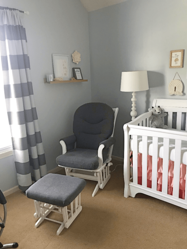 I always like to have a cozy little nursing nook, and the view from the rocking chair is important since I’ll (hopefully) spend many hours rocking and nursing our gal here. I do want to find a tiny little stool or side table for this area to set things on like nursing pads, burp cloths, and a water bottle.
