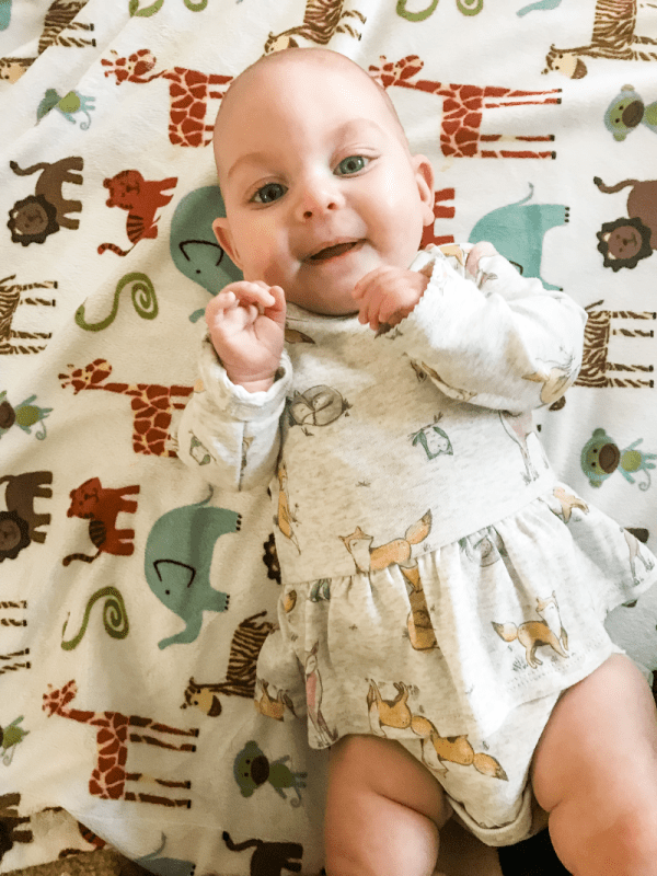 She is a total joy and the perfect addition to our little family. She’s been slower at gross motor milestones than her brothers but faster at things like laughing, recognizing faces, and saying consonant sounds. She’s starting to sit up more unassisted (she’ll sit for around 10 seconds) but she has NO interest in pushing up and crawling. She’s happy to roll across the room to get where she wants to go — less effort and just as effective!